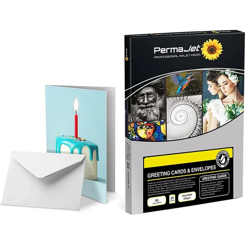 PermaJet inkjet printable pre-creased greetings cards A5 folds to A6. Each pack comes complete with white envelopes and clear self-adhesive presentation bags for that perfect finishing touch. Its never been easier to print your own professional-quality gre