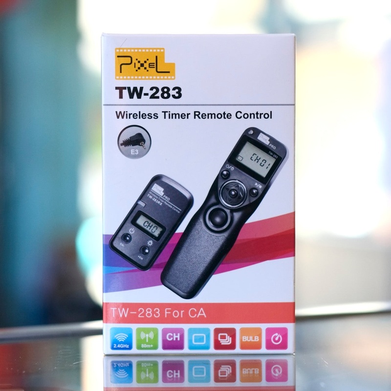 ThePixel TW-283 is a wireless shutter release for Canon cameras with E3-style "miniplug" release sockets, found in most Rebel cameras andsome fancier Canon point-and-shoots (check your camera's manual to be sure). In excellent condition, with original box.