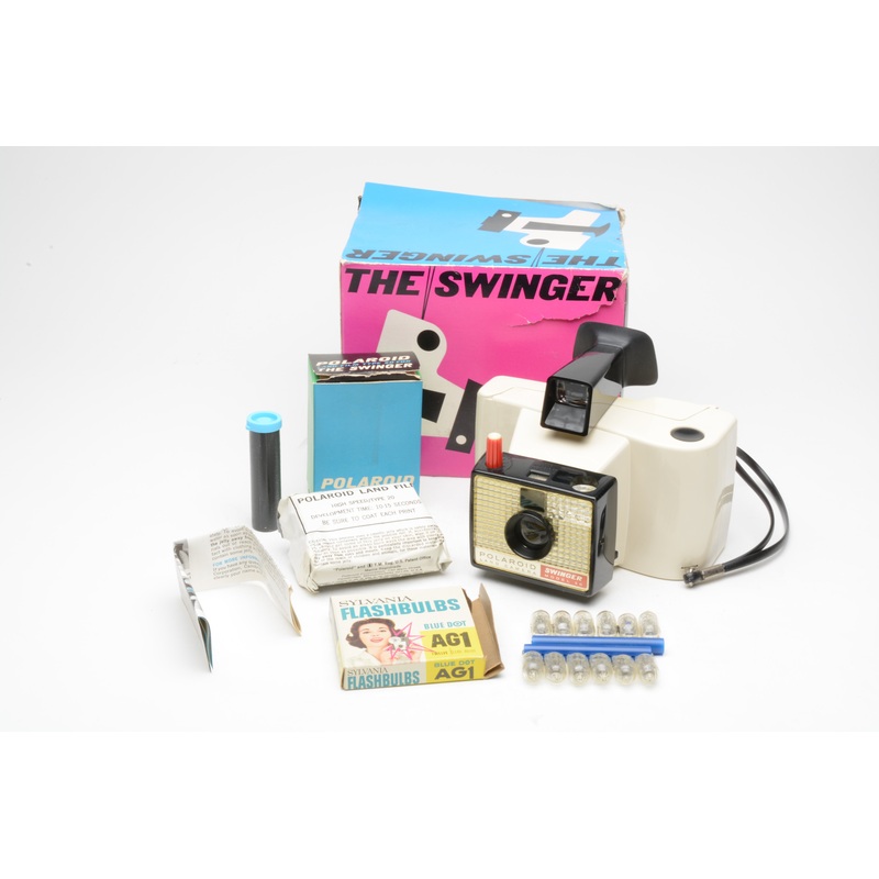 Excellent++ Condition, BoxedPolaroid The Swinger camera bundlew/Film and AG1 flashbulbs + manual and wrist strapFilm expired in 1967, sealed packVery clean condition, great collector piece
