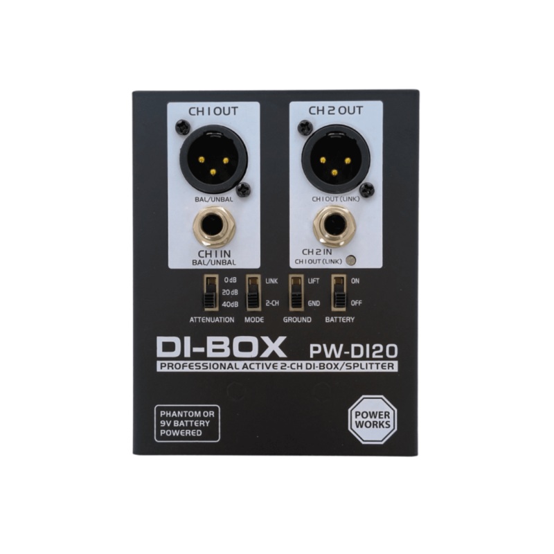 The Power Works PW-DI-20The Power Works PW-DI-20 is a professional active 2-channel DI box designed for studio and stage use, offering precise impedance matching, noise-free signal transmission, and versatile features like split mode and ground lift.Dual C
