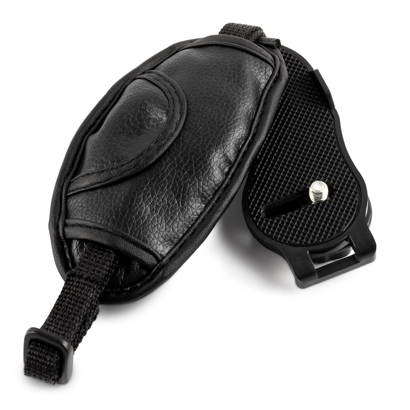 Short Description Fully padded camera strap fits around your hand and stabilizes your camera /camcorder while shooting/filming. Secure mounting design firmly mounts onto your camera base. Adjustable strap and micro-fiber padding ensures a solid and comfort