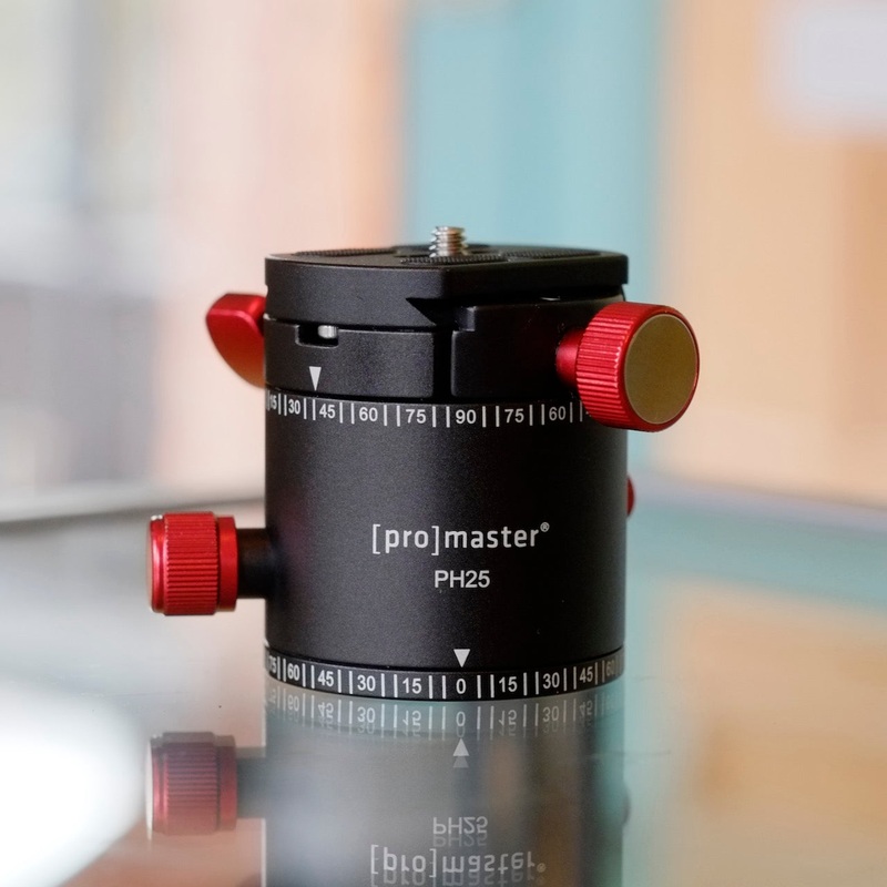 The Promaster PH25 Panoramic Head allows for specific rotational pan movements on a tripod. The upper pan control moves a full 360 degrees smoothly and the bottom has pre-determined stops that are adjustable with the knob inserted into the side.The PH25 ca