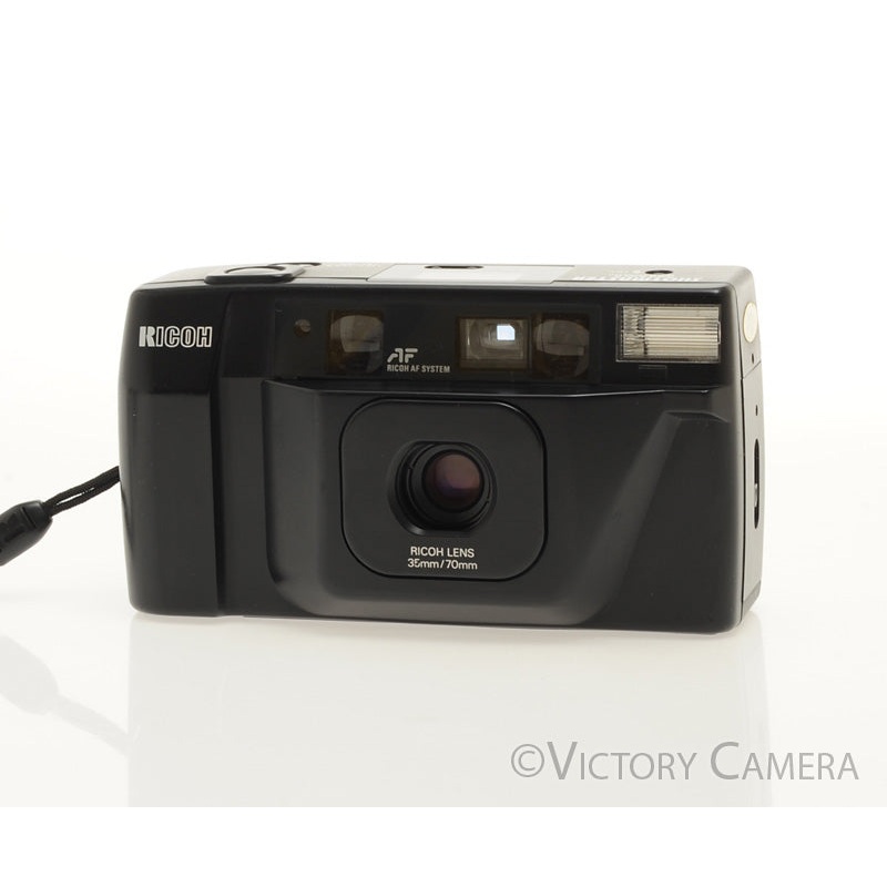 This is a nice 35mm point and shoot film camera made by Ricoh with a 35mm / 70mm lens combo. It is in excellent condition with light wear and works perfectly. The shutter and meter are accurate. The glass is clean and scratch-free with no haze, fungus, nor