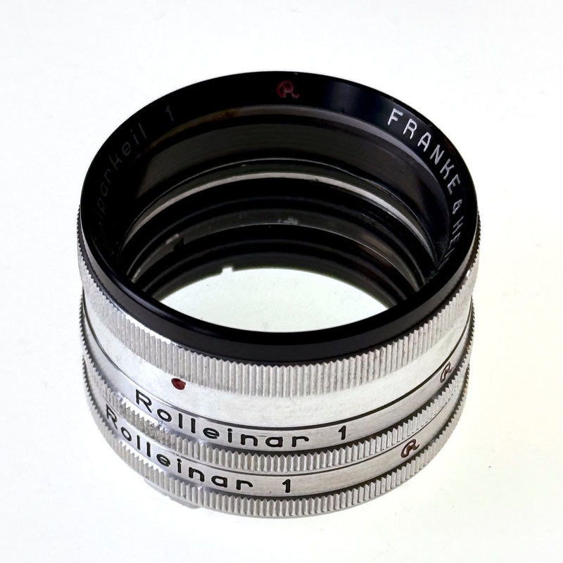 Rollei Rolleinar 1 three-piece close-up lens set for Bay 1 filter mount, with a pair of Rolleinar 1 diopters and a Rolleiparkeil parallax correction lens. In very good cosmetic condition, with clean optics.