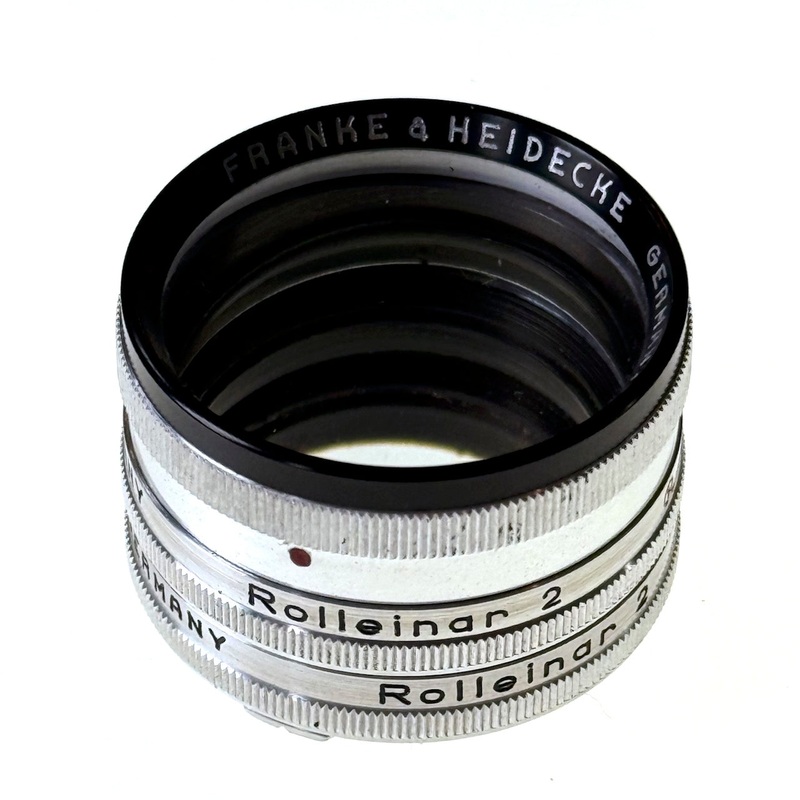Rollei Rolleinar 2 three-piece close-up lens set for Bay 1 filter mount, with a pair of Rolleinar 2 diopters and a Rolleiparkeil parallax correction lens. In very good cosmetic condition, with clean optics, original case.