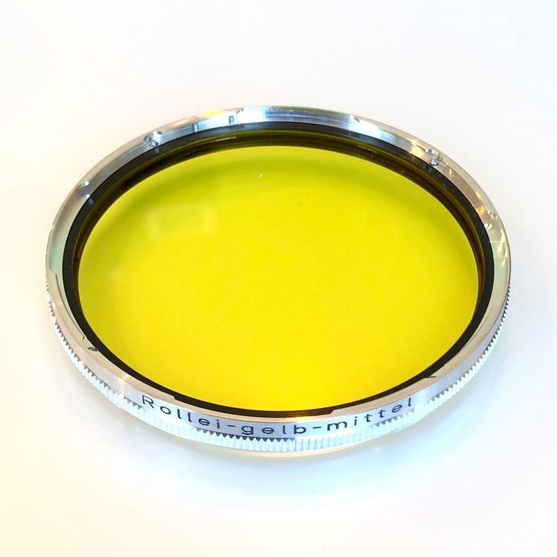RolleiGelb-Mittel (medium yellow) filter for the large Bay VI mount, found on some Rollei SL66 and 6006 lenses, among others. In excellent condition.