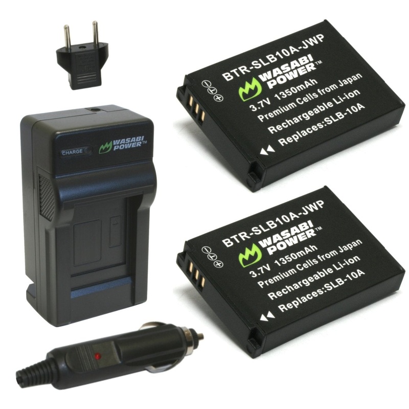 The Wasabi Power SLB10A battery and charger kit includes 2 batteries and one charger with a European plug and car adapter. All items meet or exceed OEM standards and come with a 3-year manufacturer warranty.