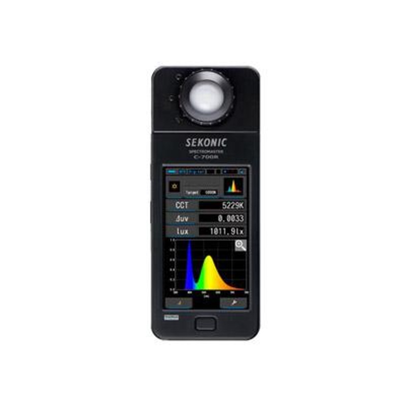 Quick Guide**Please note that this is a CE (Europe) version, not intended for US/Canada radio frequency. You should not import this product to US/Canada without permission of your local communication authority. |The Sekonic SpectroMaster C-700R is designed for motion and still image capturers who must produce quality results with proper subject color while working with multiple types and brands of light sources. A full-spectrum color meter, the C-700R can precisely measure LED, HMI, Fluorescent sources, new-style plasma lamps as well as tungsten lamps, natural light and electronic flash. Its high-resolution measuring system, featuring CMOS sensor, capture and displays spikes in light source output to provide unsurpassed color measurement accuracy. The C-700’Rs large, color touch screen displays light-source information as a color spectrum graph that is expandable for closer inspection, CRI (Ra plus R1 to R15), Kelvin (correlated color temperature), Illuminance (footcandle or Lux) and light source filtration values in Mired, CC index as well as filter correction values for major light source and lens filter brands. Its ?Multi Lights? display enables quick data comparison of four lights with full data on each at the touch of a finger. Its ?Multi Spectrum? mode enables displaying spectral graphs of three sources for quick visual comparison. Different than any spectrometer today, the C-700R meter not only displays more ways to view and compare light-source information, it also provides filtration information to correct and modify light color for cleaner recording and simpler post process. Identical to the C-700, the “R” model adds wireless triggering for your flash and camera.