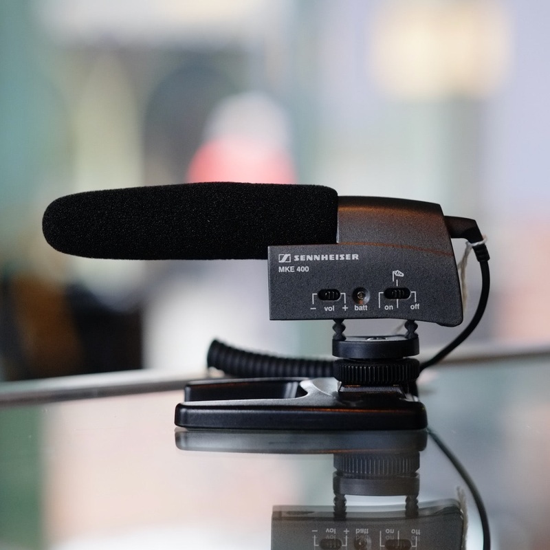 The Sennheiser MKE400 is a compact, shoe-mounted microphone with a foam cover and a removable "dead cat" windscreen (more like a dead rat in this case). Runs on a single AAA battery, connects via standard 1/8" miniplug. In excellent condition.