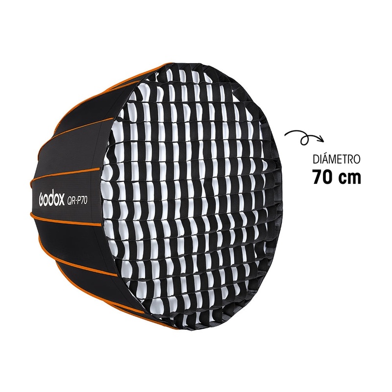 El Softbox parablico con Grid QR-P70G de la marca Godox es compatible con la montura Bowens, por lo que podrs utilizarla con una gran variedad de luces de estudio. Es ideal para fotografa de retrato o moda, ya que brinda una iluminacin suave y natural, as como un tenue reflejo en los ojos.