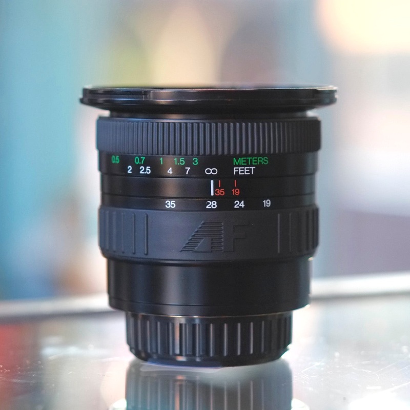 The Soligor AF Zoom 19-35mm f3.5-4.5 is an ultrawide full-frame lens for the Minolta AF lens mount. In excellent condition, with only minor cosmetic wear, light internal dust, good function.