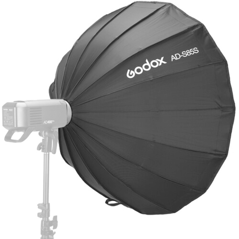 ElSoftbox Parablico AD-S85S para ad400prodeGodoxmide 33,5" y permite elegir entre un softbox (paraguas) plateado o dorado al incluir ambos.Si deseas una apariencia de tonos fros con un contraste llamativo, coloca el reflector plateado dentro del paraguas,