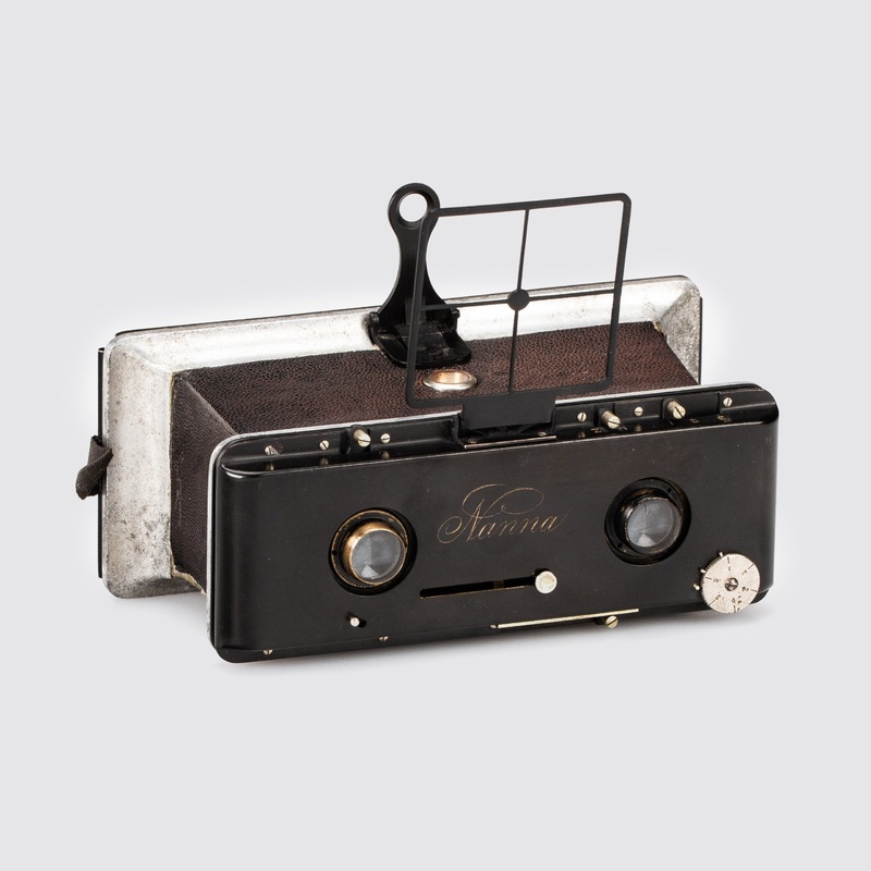 --- Rare Swiss stereo camera for 45x107mm, rigid body, folding frame finder, with Nanna film holder. --- B --- c.1909 --- 349 --- Seltene Schweizer Stereokamera fr 45x107mm, starres Gehuse, klappbarer Rahmensucher, mit Nanna Filmkassette.