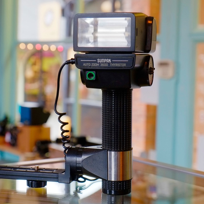 The Sunpak Auto Zoom 3600 Thyristor flash has a long handle that mounts to a tripod and a swivelling head with a 180 degree range. Its also got a bracket that attaches to your camera, and comes with a sync cable, to bring the whole somewhat large set-up to