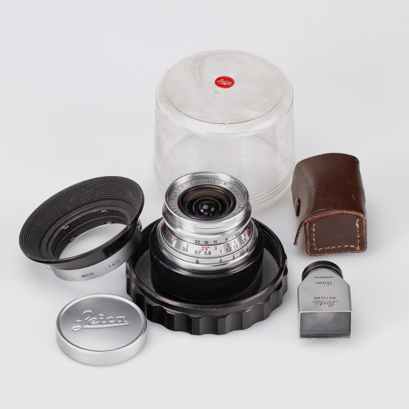 --- Beautiful set including Super-Angulon 4/21mm for Leica M in mint condition with perfect clean lenses, cap, special keeper, IWKOO metal hood, chrome 21mm finder with leather case. --- A- --- 1959 --- 1715958 --- Wunderschnes Set mit Super-Angulon 4/21mm