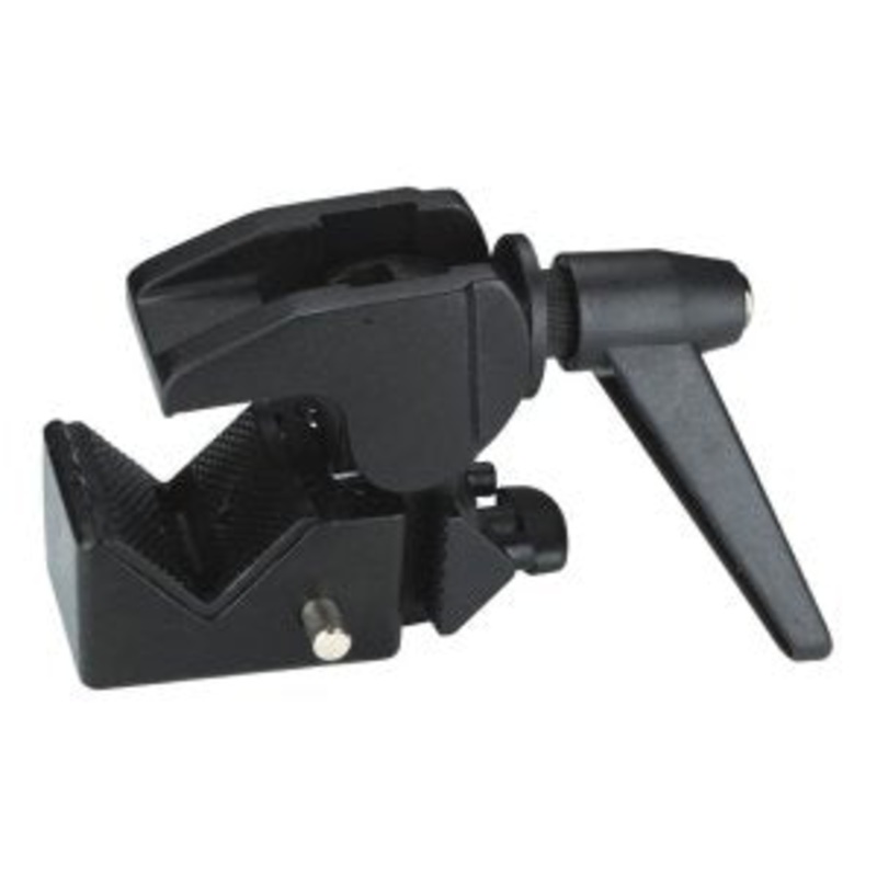 The super clamp is one of the most useful accessories for your kit bag. The 5/8" socket and padded jaws makes the placement of accessories and lights a breeze. Accepts many adapters in the 5/8" socket to give you the freedom to mount almost anything.