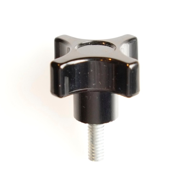 This thumbscrew has a good quality plastic four-lobe grip, plastic collar and a 1/4″ external thread.