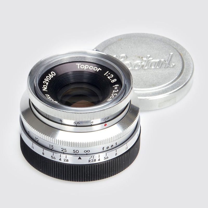 --- Mint and rare RF coupled Topcor 35mm with clean optics, Leotax front cap, rear cap. --- A- --- c,1954 --- 29060 --- Neuwertiges und seltenes RF gekuppeltes Topcor 35mm mit sauberer Optik, Leotax Frontdeckel, Rckdeckel.