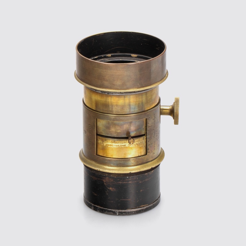 --- Large format brass Petzval lens in very fine condition with iris diaphragm, engraved 'Trousse Anachromatique d'Atelier de L, de Pullligny et St Puyo'. --- B --- c.1870 --- 37031 --- Groformatiges Messing-Petzvalobjektiv in sehr gutem Zustand mit Irisbl