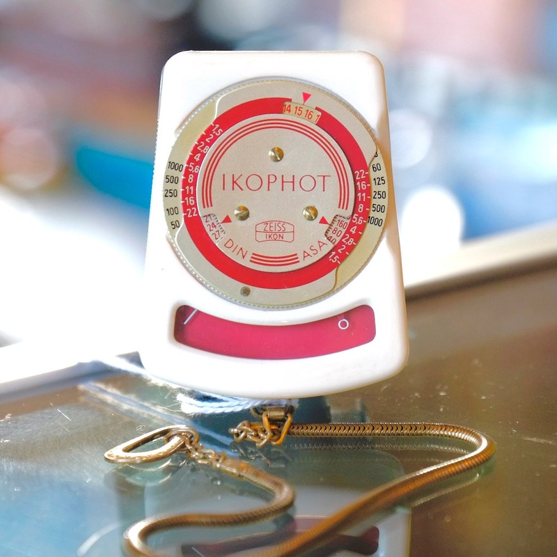 This Zeiss Ikon Ikophot is a stylish Selenium-cell light meter with an easy-to-read scale and a cool strap that clip around a button like a pocket watch. Accurate to within a stop. Has some minor cosmetic wear.